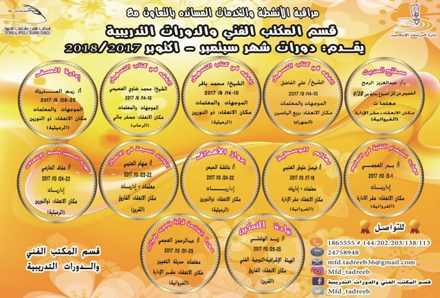 مراقبة الأنشطة والخدمات المساندة بالتعاون مع المكتب الفني والدورات التدريبية يقدم دورات شهر سبتمبر / اكتوبر 2017م للإستفسار والتواصل يرجى الإتصال على رقم 1865555 داخلي 203/113