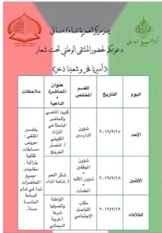 اقام دار قرآن مركز الجهراء نساء صباحي الملتقى السنوي يابذرة الخير (9) لليوم الثاني في يوم الثلاثاء الموافق 12/2/2019 لمدارس محافظة الجهراء وتضمن محاضرة للأستاذة/ معالي الخس , بعنوان " المحبة في الله " وضيافة وإهداءات من قسم الفقه , وهدايا للمدرسات والطالبات من قسم التواصل الاجتماعي